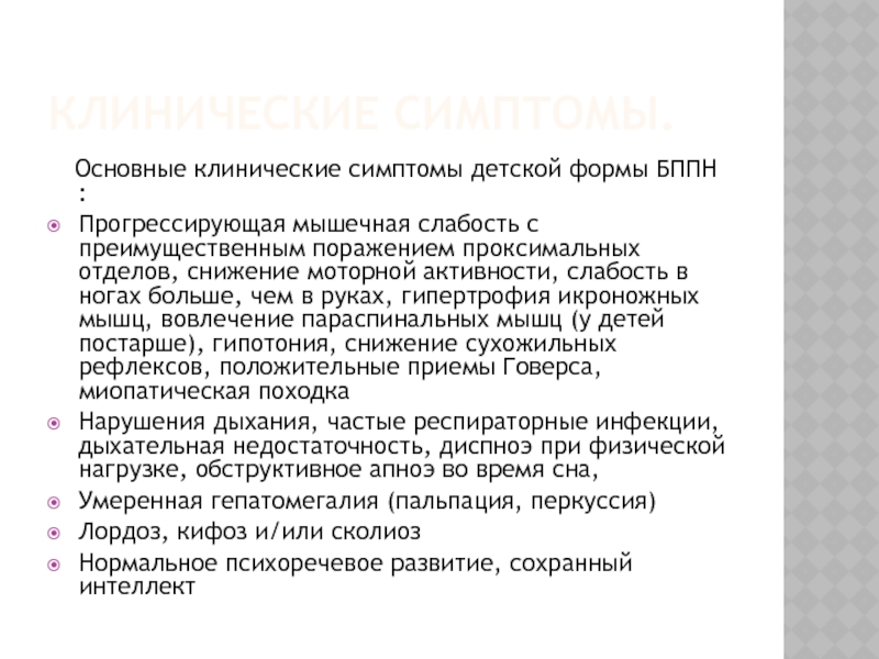 Основные клинические симптомы детской формы БППН :