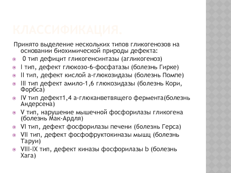 Принято выделение нескольких типов гликогенозов на основании биохимической природы дефекта:
