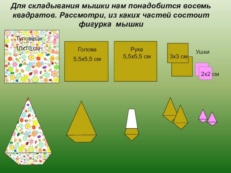 Для складывания мышки нам понадобится восемь квадратов. Рассмотри, из каких частей состоит фигурка мышкиРука5,5х5,5 см3х3 см2х2 см