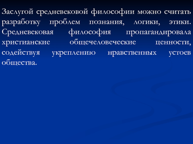 Средневековая философия пропагандировала христианские общечеловеческие ценности, содействуя укреплению нравственных устоев