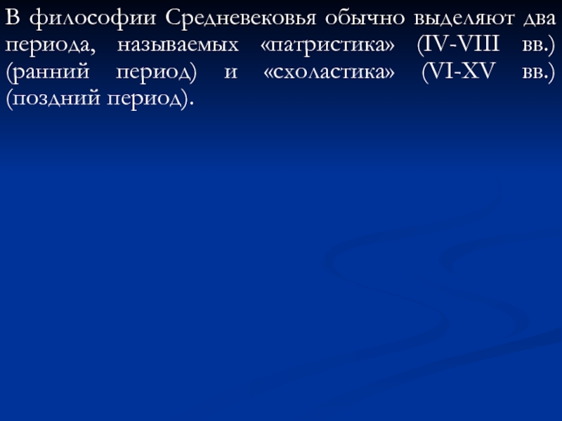 Слайд 14В философии Средневековья обычно выделяют два периода, называемых «патристика» (IV-VIII
