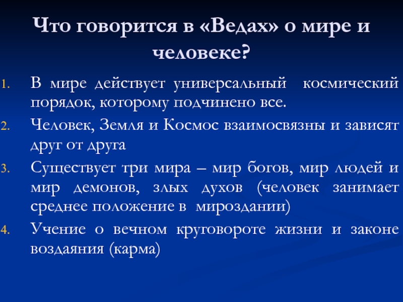 Слайд 12Что говорится в «Ведах» о мире и человеке?