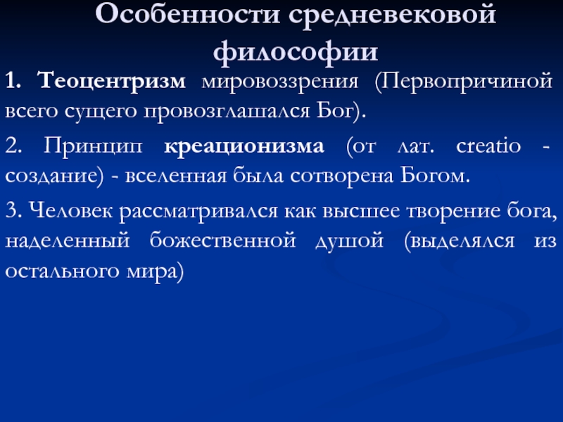 1. Теоцентризм мировоззрения (Первопричиной всего сущего провозглашался Бог).