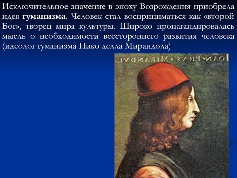 Слайд 19Исключительное значение в эпоху Возрождения приобрела идея гуманизма. Человек стал