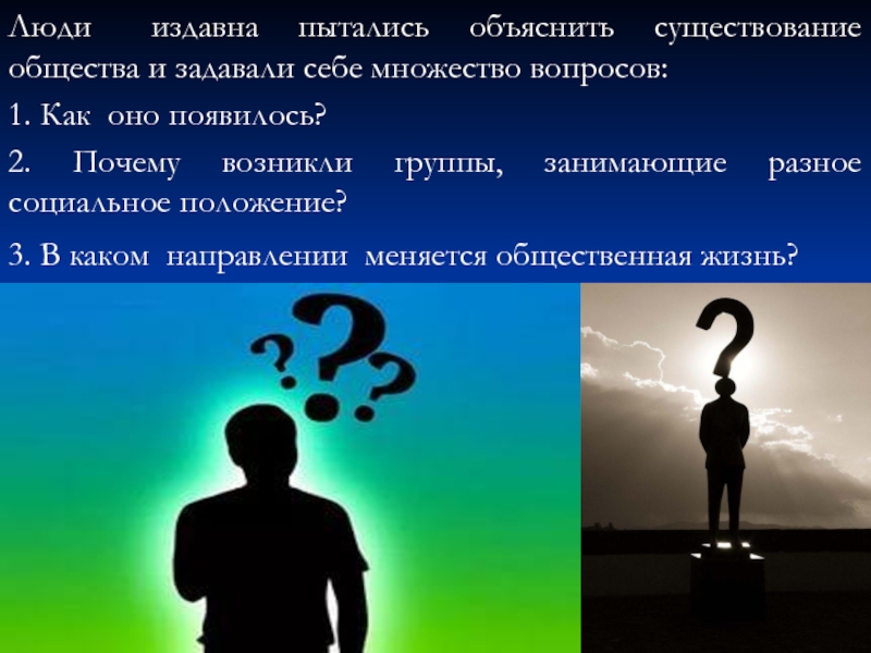 Слайд 2Люди издавна пытались объяснить существование общества и задавали себе