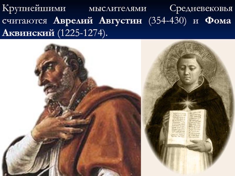 Слайд 16Крупнейшими мыслителями Средневековья считаются Аврелий Августин (354-430) и Фома Аквинский