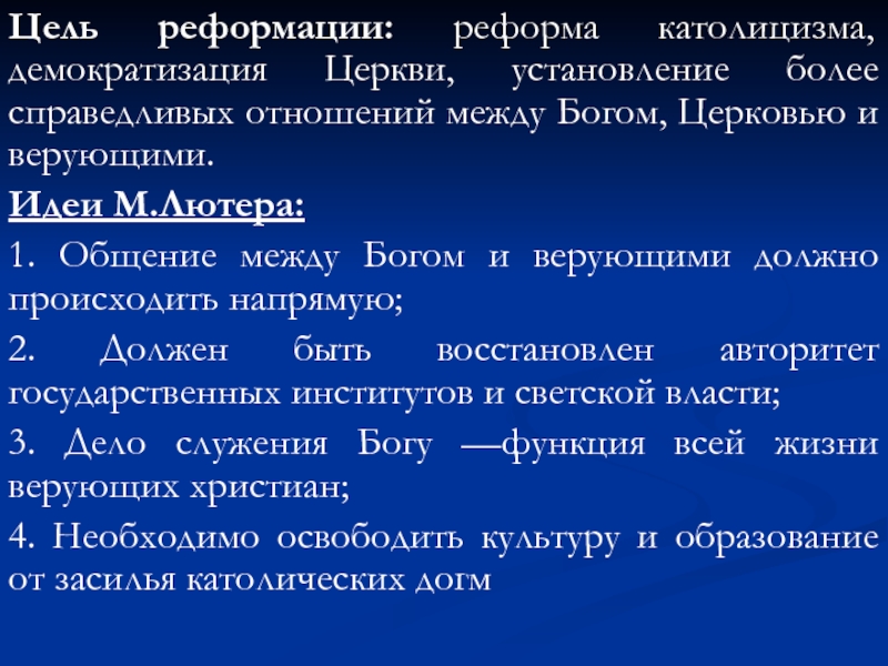 Слайд 21Цель реформации: реформа католицизма, демократизация Церкви, установление более справедливых отношений
