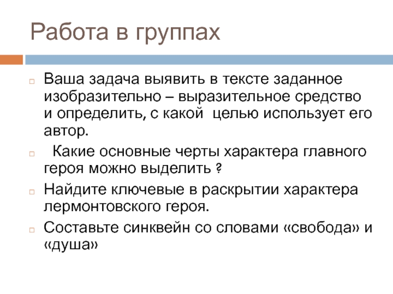 Слова «свобода», «природа», «воля», «судьба», «душа» - ключевые в раскрытии характера лермонтовского героя.