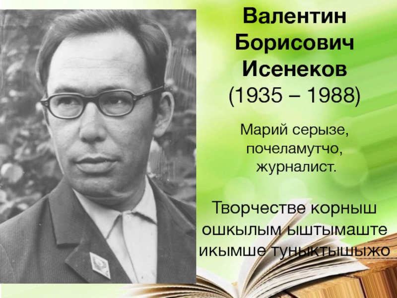 Валентин БорисовичИсенеков(1935 – 1988) Марий серызе, почеламутчо, журналист. Творчестве корныш ошкылым ыштымаште икымше туныктышыжо