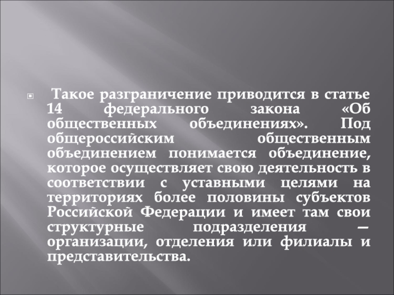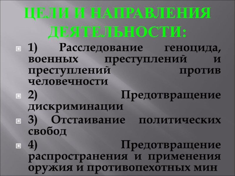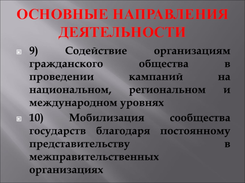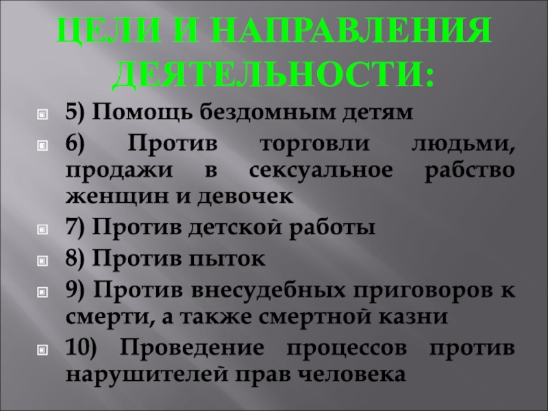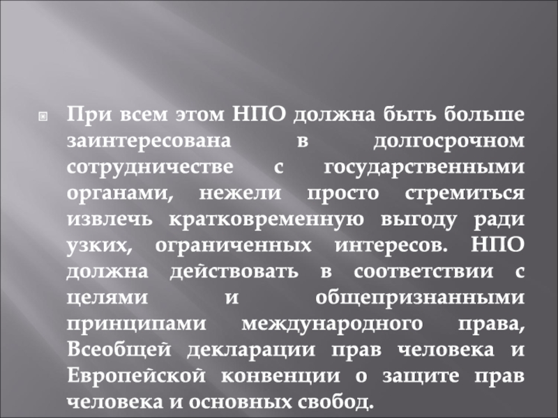 ради узких, ограниченных интересов. НПО должна действовать в соответствии с целями и общепризнанными принципами международного права, Всеобщей декларации прав человека и Европейской конвенции о защите прав человека и основных свобод.