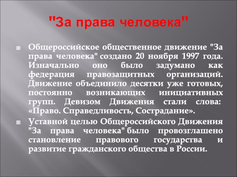 Уставной целью Общероссийского Движения "За права человека" было провозглашено становление правового государства и развитие гражданского общества в России.