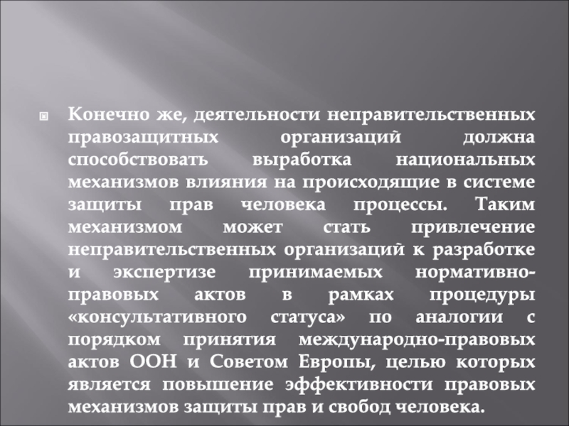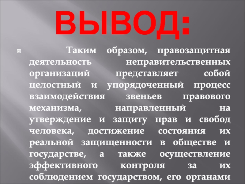 Таким образом, правозащитная деятельность неправительственных организаций представляет собой