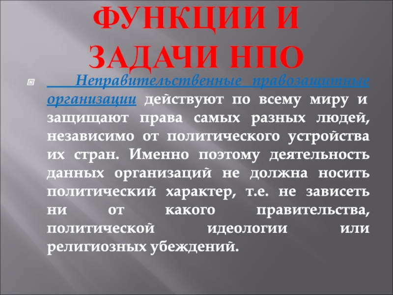 политического устройства их стран. Именно поэтому деятельность данных организаций не должна носить политический характер, т.е. не зависеть ни от какого правительства, политической идеологии или религиозных убеждений.