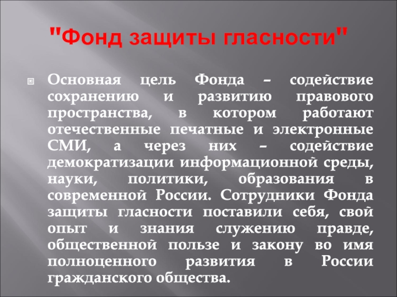 а через них – содействие демократизации информационной среды, науки, политики, образования в современной России. Сотрудники Фонда защиты гласности поставили себя, свой опыт и знания служению правде, общественной пользе и закону во имя полноценного развития в России гражданского общества.
