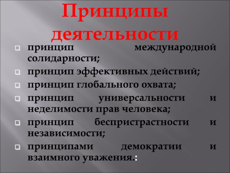 всеобщности и неделимости прав человека; беспристрастности и независимости, а так же демократии и взаимоуважения.