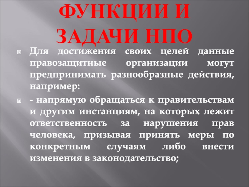 Таким образом, задачами деятельности неправительственных правозащитных организаций