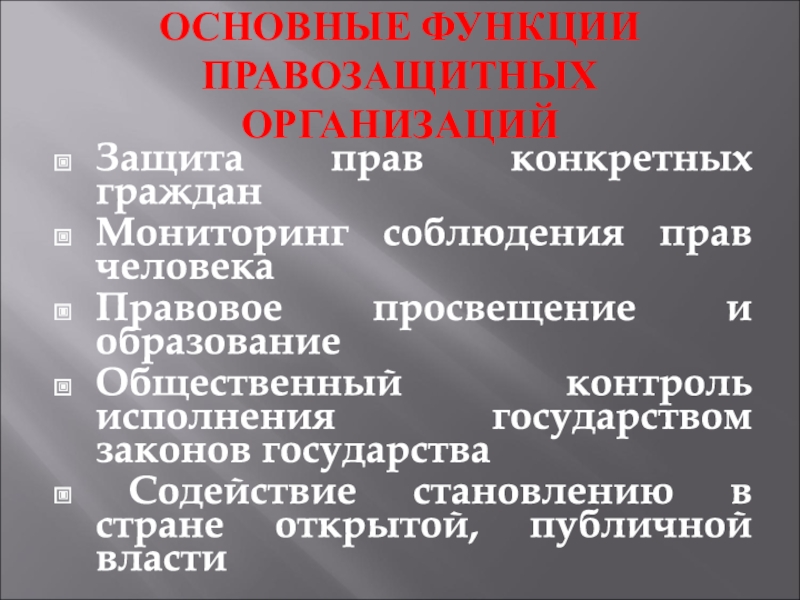 Слайд 4ОСНОВНЫЕ ФУНКЦИИ ПРАВОЗАЩИТНЫХ ОРГАНИЗАЦИЙ