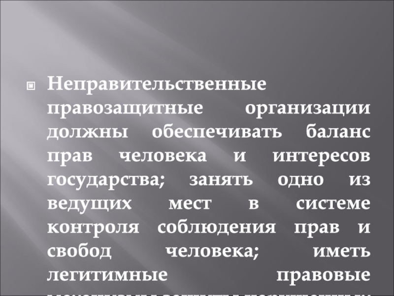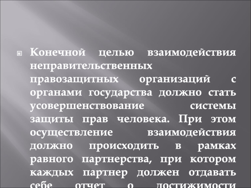 Слайд 81Конечной целью взаимодействия неправительственных правозащитных организаций с органами государства должно