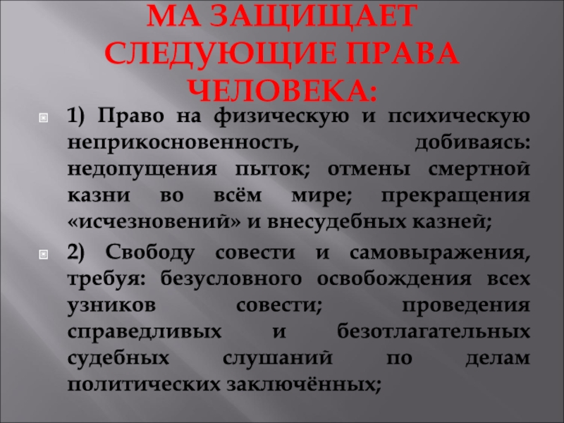 являются: «неофициальная» защита прав и свобод человека, закрепленных в международно-правовых