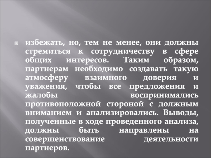 атмосферу взаимного доверия и уважения, чтобы все предложения и жалобы воспринимались противоположной стороной с должным вниманием и анализировались. Выводы, полученные в ходе проведенного анализа, должны быть направлены на совершенствование деятельности партнеров.