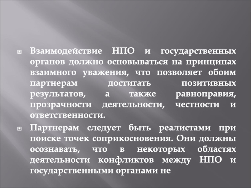 Слайд 83Взаимодействие НПО и государственных органов должно основываться на принципах взаимного