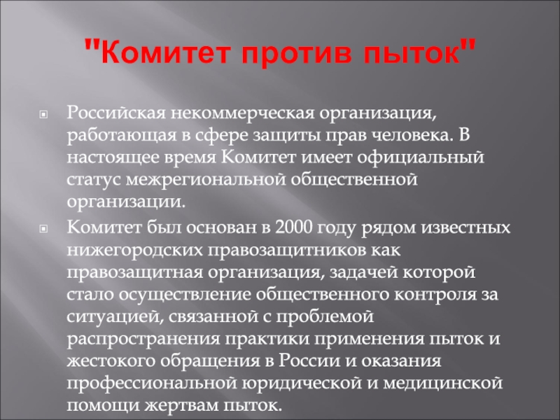 Комитет был основан в 2000 году рядом известных нижегородских правозащитников как правозащитная организация, задачей которой стало осуществление общественного контроля за ситуацией, связанной с проблемой распространения практики применения пыток и жестокого обращения в России и оказания профессиональной юридической и медицинской помощи жертвам пыток.