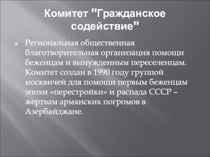 переселенцам. Комитет создан в 1990 году группой москвичей для помощи