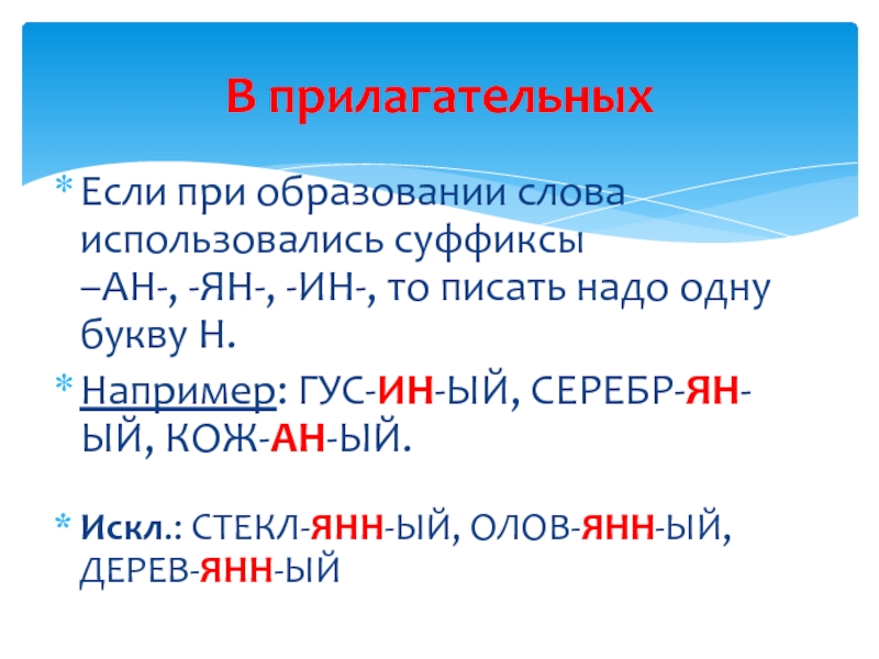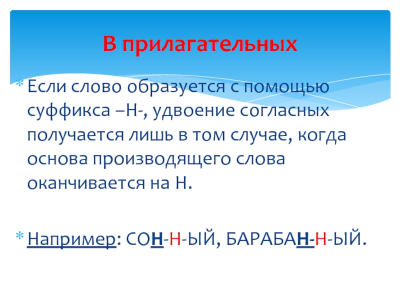 Н.Например: СОН-Н-ЫЙ, БАРАБАН-Н-ЫЙ.