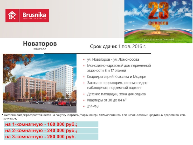 Слайд 1* Система скидок распространяется на покупку квартиры/паркинга при 100% оплате