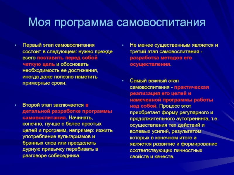 Второй этап заключается в детальной разработке программы самовоспитания. Начинать, конечно, лучше с более простых целей и программ, например: изжить употребление вульгаризмов и бранных слов или преодолеть дурную привычку перебивать в разговоре собеседника.