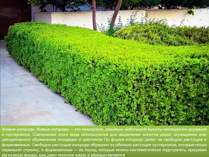 Слайд 7Живые изгороди. Живые изгороди — это неширокие, рядовые, небольшой высоты