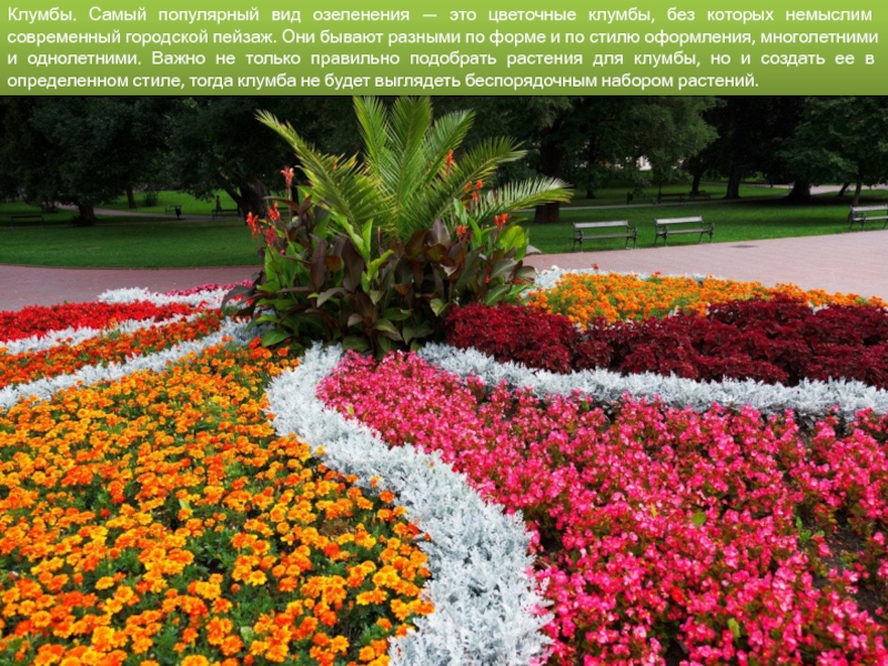 Слайд 2Клумбы. Самый популярный вид озеленения — это цветочные клумбы, без