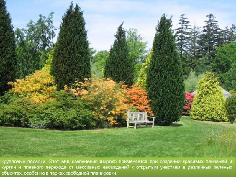 Слайд 5Групповые посадки. Этот вид озеленения широко применяется при создании красивых