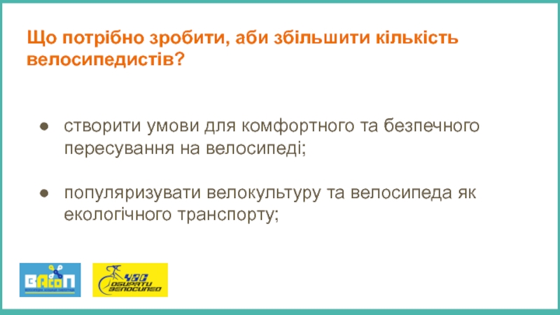 Що потрібно зробити, аби збільшити кількість велосипедистів?створити умови для комфортного та безпечного пересування на велосипеді; популяризувати велокультуру