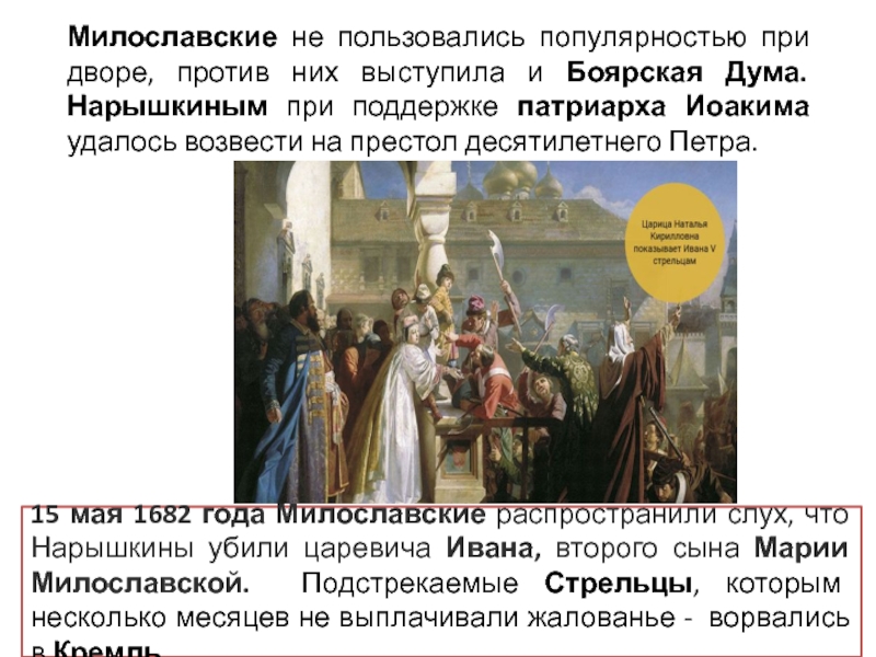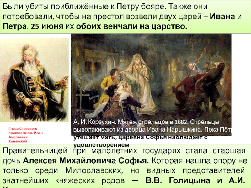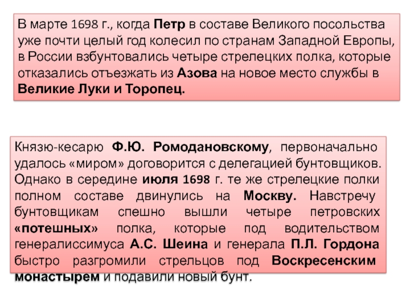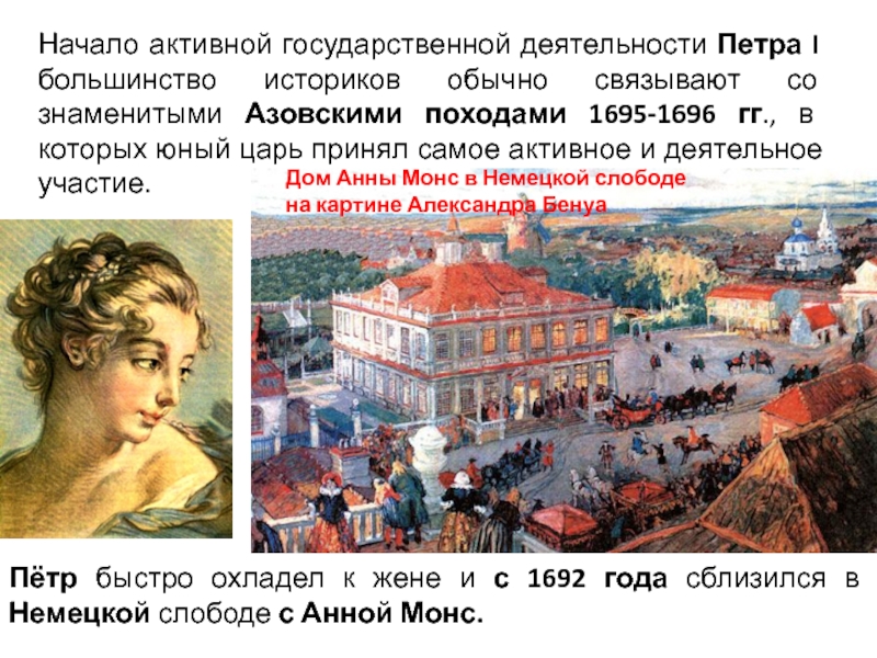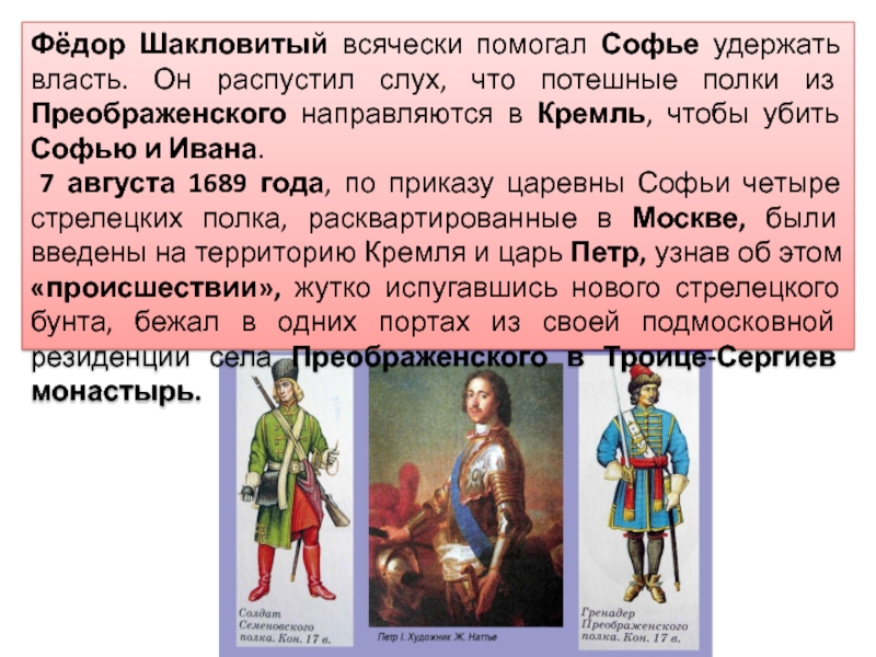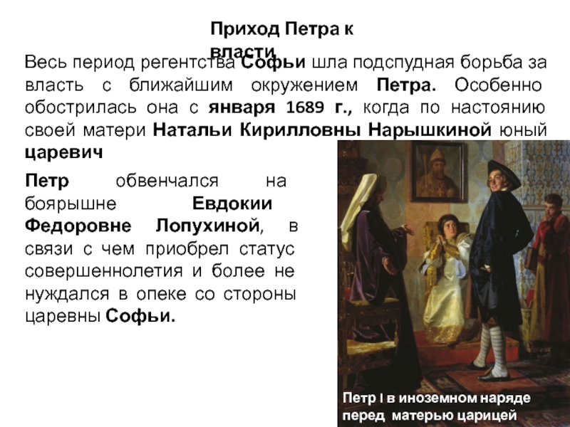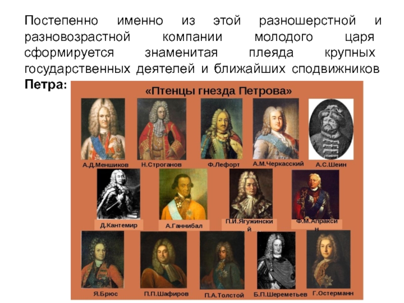 .К. Нарышкин, Б.А. Голицын, П.А. Лопухин, Т.Н. Стрешнев и другие. Сам же юный монарх практически все свое время проводил либо в Немецкой слободе (Кокуй) у своей зазнобы Анны Монс, либо в потехах со своими сверстниками и друзьями в царских селах Измайлово, Преображенское и других .