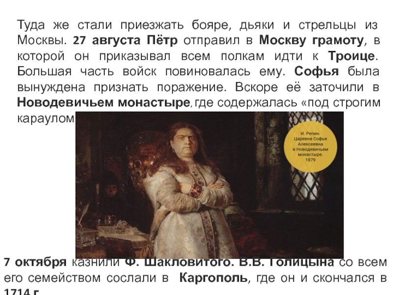 23 сентября 1698 года Евдокию Лопохину отправили в Суздальско-Покровский монастырь (традиционное место ссылки цариц), где она была пострижена под именем Елены.