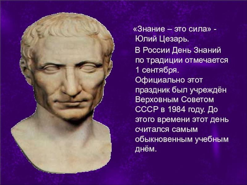 «Знание – это сила» - Юлий Цезарь. В России День Знаний по традиции отмечается 1 сентября. Официально этот праздник был учреждён Верховным Советом СССР в 1984 году. До