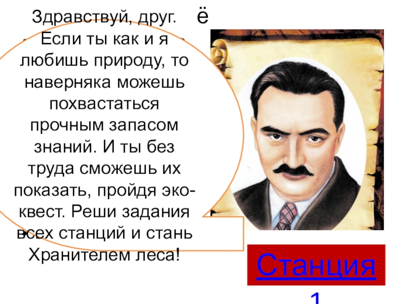 Здравствуй, друг. Если ты как и я любишь природу, то наверняка можешь похвастаться прочным запасом знаний. И ты без труда сможешь их показать, пройдя эко-квест. Реши задания всех станций и стань Хранителем леса!