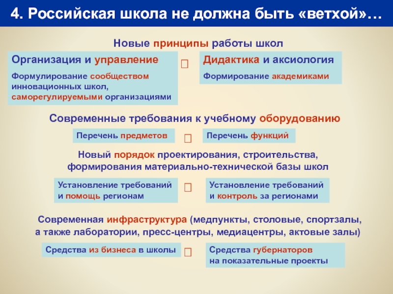 4. Российская школа не должна быть «ветхой»… Новые принципы работы школ ?Современные требования к учебному оборудованиюОрганизация и