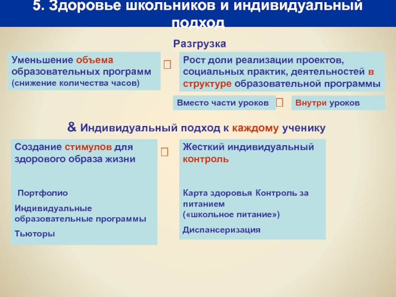 5. Здоровье школьников и индивидуальный подход Разгрузка ?& Индивидуальный подход к каждому ученикуУменьшение объема образовательных программ (снижение