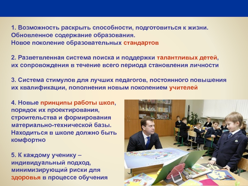 1. Возможность раскрыть способности, подготовиться к жизни. Обновленное содержание образования. Новое поколение образовательных стандартов 2. Разветвленная система поиска и поддержки талантливых детей, их сопровождения в течение всего периода