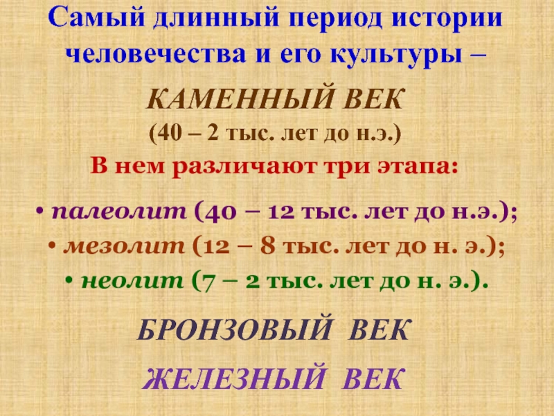 Слайд 2Самый длинный период истории человечества и его культуры –