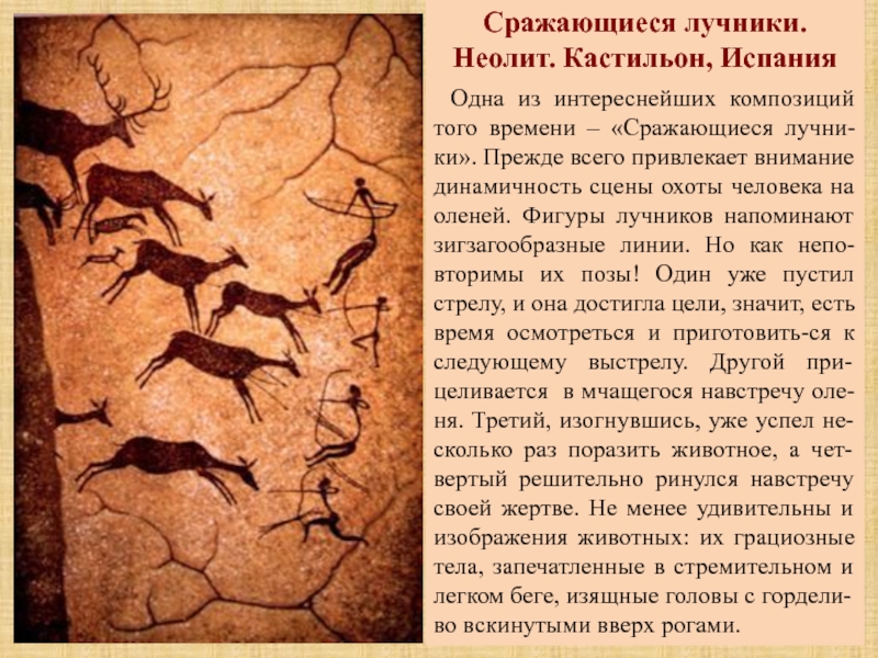 «Сражающиеся лучни-ки». Прежде всего привлекает внимание динамичность сцены охоты человека