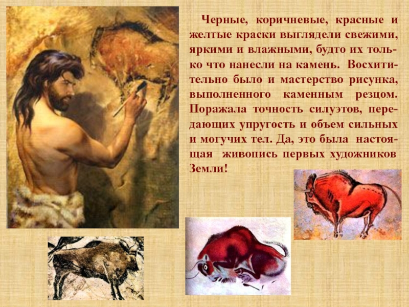 было и мастерство рисунка, выполненного каменным резцом. Поражала точность силуэтов, пере-дающих упругость и объем сильных и могучих тел. Да, это была настоя-щая живопись первых художников Земли!