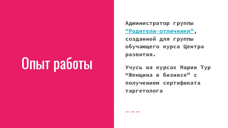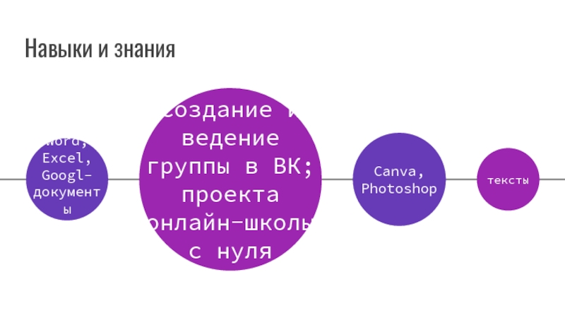 Навыки и знанияWord, Excel,Googl- документыСоздание и ведение группы в ВК; проекта онлайн-школы с нуляCanva, Photoshopтексты