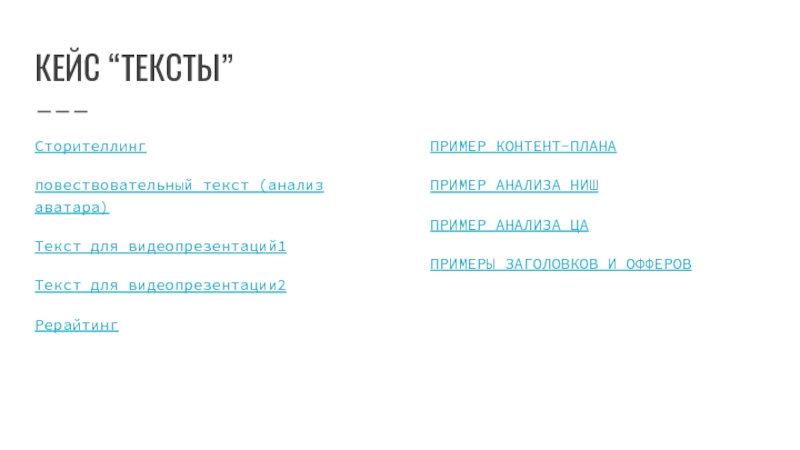 КЕЙС “ТЕКСТЫ”Сторителлингповествовательный текст (анализ аватара)Текст для видеопрезентаций1Текст для видеопрезентации2РерайтингПРИМЕР КОНТЕНТ-ПЛАНАПРИМЕР АНАЛИЗА НИШПРИМЕР АНАЛИЗА ЦАПРИМЕРЫ ЗАГОЛОВКОВ И ОФФЕРОВ