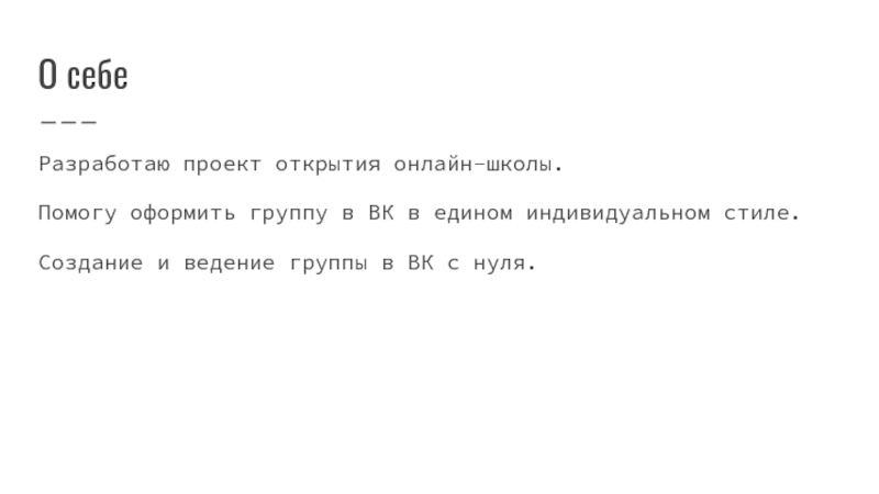 О себеРазработаю проект открытия онлайн-школы. Помогу оформить группу в ВК в едином индивидуальном стиле.Создание и ведение группы в ВК с нуля.