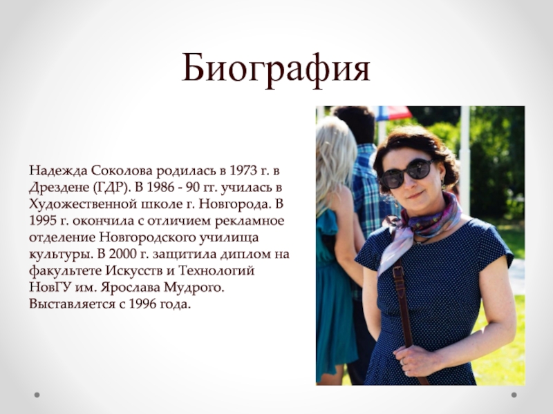Биография Надежда Соколова родилась в 1973 г. в Дрездене (ГДР). В 1986 - 90 гг. училась в Художественной школе г. Новгорода. В 1995 г. окончила с отличием рекламное отделение Новгородского училища