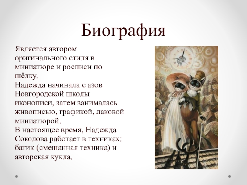 графикой, лаковой миниатюрой. В настоящее время, Надежда Соколова работает в техниках: батик (смешанная техника) и авторская кукла.