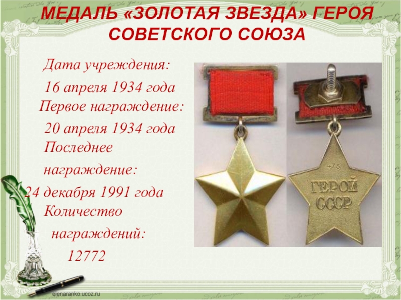 Слайд 4МЕДАЛЬ «ЗОЛОТАЯ ЗВЕЗДА» ГЕРОЯ СОВЕТСКОГО СОЮЗА